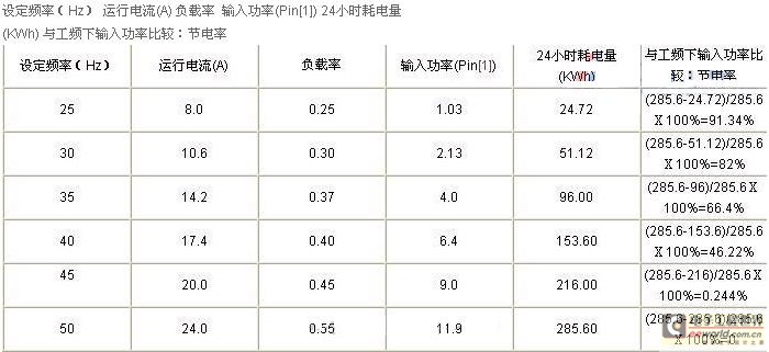 針對(duì)這一特殊要求制定方案,對(duì)其中兩臺(tái)對(duì)開(kāi)電機(jī)進(jìn)行開(kāi)環(huán)變頻調(diào)速控制,配合兩臺(tái)全速風(fēng)機(jī),即滿足不同材料的溫控要求,又能節(jié)約電能。按照這一方案進(jìn)行改造后,節(jié)電效果非常明顯。針對(duì)其中一種材料需固定頻率控制進(jìn)行冷卻,幾個(gè)月才換一次,設(shè)定頻率在25—35之間,完全滿足冷卻要求。工頻下運(yùn)行時(shí)一臺(tái)18.5KW風(fēng)機(jī)(經(jīng)變頻器輸出),每小時(shí)耗電為11.9度/小時(shí),日耗電量為:285.6度/24小時(shí)。在正常運(yùn)行時(shí)根據(jù)不同材料的溫度要求,設(shè)定頻率分別為:25Hz、30 Hz、35 Hz、40 Hz和45 Hz。運(yùn)行測(cè)定參數(shù)如下: