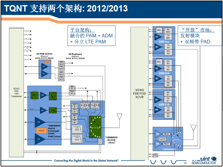 對(duì)于多頻多模的3G/4G手機(jī),針對(duì)射頻前端器件的設(shè)計(jì)如何實(shí)現(xiàn)集成?熊挺表示,目前有兩種方案:一種是融合架構(gòu),將不同頻率的射頻功率放大器PA集成;另一種架構(gòu)則是沿信號(hào)鏈路的集成,即將PA與雙工器集成。兩種方案各有優(yōu)缺點(diǎn),適用于不同的手機(jī)。融合架構(gòu),PA的集成度高,對(duì)于3個(gè)以上頻帶巨有明顯的尺寸優(yōu)勢,5-7個(gè)頻帶時(shí)還巨有明顯的成本優(yōu)勢。缺點(diǎn)是雖然PA集成了,但是雙工器仍是相當(dāng)復(fù)雜,并且PA集成時(shí)有開關(guān)損耗,性能會(huì)受影響。而對(duì)于后一種架構(gòu),性能更好,功放與雙功器集成可以提升電流特性。所以TriQuint可以提供兩種架構(gòu)的方案,大于6個(gè)頻段時(shí)(指3G和4G)采用融合架構(gòu),而小于四個(gè)頻段時(shí)采用PA與雙工器集成的方案PAD。