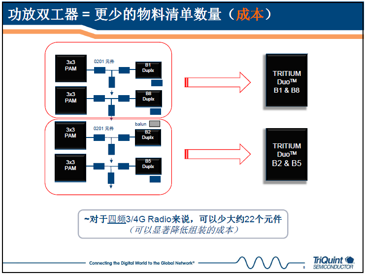 TRITIUM DUO™為每個(gè)頻帶都做了優(yōu)化,因此與可配置的放大器不同,它在放大完成后不需要切換,從而實(shí)現(xiàn)一個(gè)更高性能,更高效的射頻解決方案。而且TriQuint領(lǐng)先的無源器件可多模式操作,符合3G和4G標(biāo)準(zhǔn),一個(gè)采用TRITIUM DUO™的4頻帶解決方案可有效降低物料清單成本,提升制造和供應(yīng)鏈效率。