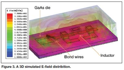 第二個(gè)關(guān)注的地方是微帶線附近的場(chǎng)線,在靠近地平面的地方它們最強(qiáng)。只要屏蔽和地平面間的距離明顯大于微帶線和地平面間的距離,則增加的屏蔽的效用就微乎其微。線綁定和表貼電感與地平面的直接耦合要弱些,當(dāng)施加屏蔽時(shí),預(yù)期其場(chǎng)線會(huì)有變化。圖3顯示的是3D模擬的E場(chǎng)分布。