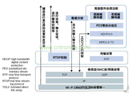 Wi-Fi Display是以無需經(jīng)由WLAN接入點即可在終端間直接通信的標準“Wi-Fi Direct”為基礎(chǔ),由上層的協(xié)議棧軟件構(gòu)成的安裝指南。鎖定終端服務(wù)的“服務(wù)發(fā)現(xiàn)(Service Discovery)”等的處理利用Wi-Fi Direct進行,影像的壓縮/解壓處理及管理數(shù)據(jù)流的傳輸層等利用Wi-Fi Display處理(圖2)。壓縮/解壓采用H.264格式。由于最近的智能手機不但標配WLAN功能,采用內(nèi)置H.264編解碼器電路GPU的終端也很多,因此Wi-Fi Display還具有易于配備到終端中的特點。“在受限于安裝面積和耗電量的智能手機中,無需追加硬件即可配備的優(yōu)勢非常大”(Cavium公司的柴田)。