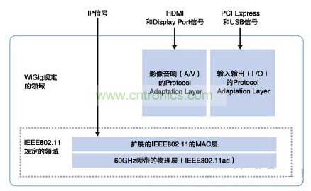 WiGig雖然是最后出現(xiàn)的,但作為非壓縮方式的有力候補,其存在不容忽視。WiGig在60GHz頻帶的物理層及擴展了IEEE802.11的MAC層上,規(guī)定了處理HDMI和Display-Port等信號的擴展標準(圖4)。MAC層之所以與IEEE802.11標準確保了向后兼容,是因為設(shè)想了在平時使用WLAN,只在傳輸影像等時使用60GHz頻帶等用途。WiGig Alliance與Wi-Fi Alliance共同制定了認證計劃等,WiGig將來還有可能會與WLAN整合。