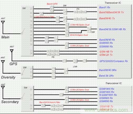 現(xiàn)在的TD-LTE對應(yīng)終端,為了對應(yīng)語音通話,三重模式和雙模式的GSM和UMTS是必不可少的。GSM就預(yù)見到了海外漫游的這個(gè)問題,因此一般能對應(yīng)850MHz、900MHz、1800MHz、1900MHz四個(gè)不同頻帶,在接收側(cè)的每一個(gè)頻帶上都逐個(gè)搭載了濾波器。UMTS的band1為FDD,所以需要雙工器(天線雙工器)。