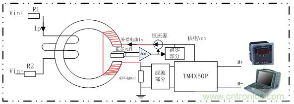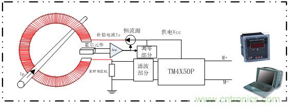 閉環(huán)式霍爾電流變送器是在直測式霍爾電流傳感器的基礎(chǔ)上發(fā)展起來的,主要由原邊電路、聚磁環(huán)、霍爾器件、次級(jí)線圈和放大電路、采樣電路、調(diào)零電路以及隔離變送模塊組成,如圖1。主回路電流IP 在聚磁環(huán)所產(chǎn)生的磁場,通過一個(gè)次級(jí)線圈的電流產(chǎn)生的磁場進(jìn)行補(bǔ)償,使霍爾器件始終處于檢測零磁通的工作狀態(tài)。流經(jīng)次級(jí)線圈的電流Is經(jīng)過精密電阻RL進(jìn)行采樣,為了減小恒流源的負(fù)載能力,此精密電阻RL的阻值較小。精密電阻將電流信號(hào)變換成mV的電壓信號(hào),此信號(hào)經(jīng)過濾波器的濾波作用后直接接入金升陽TM系列信號(hào)調(diào)理模塊進(jìn)行信號(hào)隔離放大變換,變換換成工業(yè)需要的標(biāo)準(zhǔn)信號(hào),如4-20mA、0-20mA、 l-5V、0-5V等標(biāo)準(zhǔn)直流信號(hào),供給智能儀表顯示或者直接供給現(xiàn)場PLC或DCS系統(tǒng)使用。如果原邊電流Ip發(fā)生變化,則Ip產(chǎn)生的磁通發(fā)生變化,則在霍爾元件的兩表面產(chǎn)生電勢差,此電勢差經(jīng)過運(yùn)放的放大作用,直接控制Is補(bǔ)償電流的大小,此補(bǔ)償電流恰好與被測電流的方向相反,從而補(bǔ)償了原來的磁場,使得霍爾器件處于零磁通的狀態(tài)中。所以Is的電流可以真實(shí)地反映出原邊Ip的電流的變化,反應(yīng)速度快。