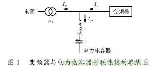 電力電容器由于諧波引起并聯(lián)諧振,則有異常電流流入電容器,其結(jié)果是導(dǎo)致電容器過熱,絕緣層被破壞。通常,當(dāng)電源阻抗充分小(電源設(shè)備容量大)時產(chǎn)生的故障很少,但要考慮高次諧波對低壓電力電容的影響,因此可使用帶6豫串聯(lián)電抗器的電力電容器來減小諧波干擾,電抗器與電力容器、變頻器連接圖如圖1所示。