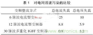 為了將諧波產(chǎn)生的種種干擾防患于未然,應(yīng)該在發(fā)生源(變頻器)側(cè)抵制高次諧波。首先主電路可選擇采用多脈沖數(shù)整流、多電平輸出形式,諧波少對電網(wǎng)的污染也小,如表1 所列。從表中看出主電路整流脈波數(shù)多三電平輸出可達(dá)到高標(biāo)準(zhǔn)的要求。還可采用動態(tài)消除諧波的方法,當(dāng)然成本就會增加,但要比較權(quán)衡。