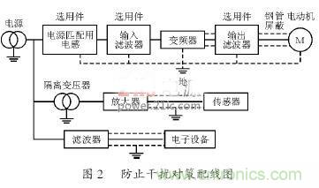 為了防止干擾,采用圖圓所示的方案。變頻器本身用鐵殼屏蔽,輸出線用鋼管屏蔽,并與其它弱電信號分別配線,附近的其它靈敏電子設(shè)備線路也要屏蔽;為了減少電磁噪聲,可以配置輸出濾波器;為了減少對電源的污染,可配置輸入濾波器或零序電感,還可與晶閘管整流裝置,功率因數(shù)補償器并聯(lián)使用。電源變壓器容量大于10倍變頻器容量,或電源電壓不平衡率超過3豫時需接電源匹配用電感器,采用電感后對電源改善效果良好,小容量變頻器安裝有匹配電感時使功率因數(shù)有提高,大容量時雖對功率因數(shù)無提高,但可改善變頻器運行,同時起到濾波作用。