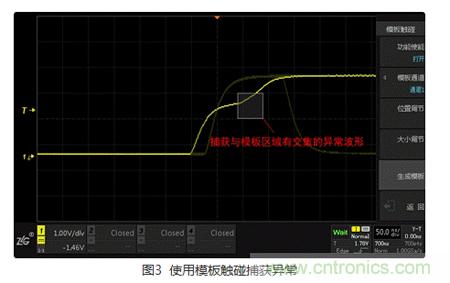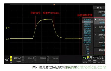 通過Step1,可以大概了解到異常信號的特性,將其特有的條件視為觸發(fā)條件,利用觸發(fā)可快速的捕獲異常信號。ZDS2000系列示波器免費(fèi)標(biāo)配了多種“觸發(fā)類型”,其中包括11種基礎(chǔ)觸發(fā),21種協(xié)議觸發(fā)。另外,用戶還可根據(jù)波形的形狀特性,使用“模板觸發(fā)”,讓觸發(fā)更加隨心所欲。