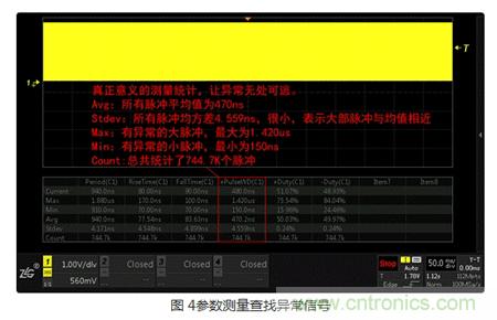 僅僅通過波形的直觀表現(xiàn)來分析異常信號遠(yuǎn)遠(yuǎn)不夠,只有將波形各項(xiàng)指標(biāo)精確量化,才能看透波形異常的本質(zhì)。ZDS2000系列示波器標(biāo)配的51種“真正意義”的參數(shù)測量,會把屏幕上捕獲的所有波形進(jìn)行統(tǒng)計(jì)分析,得出每一項(xiàng)的當(dāng)前值、最大值、最小值、平均值、標(biāo)準(zhǔn)差、統(tǒng)計(jì)次數(shù),用戶通過觀察最大值和最小值可快速了解波形中可能存在的異常,通過觀察平均值、標(biāo)準(zhǔn)差可快速評估信號特性。