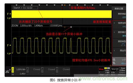 在調(diào)試異常信號時(shí),我們通常需要明確,異常出現(xiàn)的頻率是多少,是不是周期性出現(xiàn)的呢?為了弄清楚這些問題,一般需要長時(shí)間記錄波形,然后基于這樣一個(gè)龐大的數(shù)據(jù)庫去定位和分析異常。ZDS2000系列示波器標(biāo)配的“搜索功能”,可以在海量的數(shù)據(jù)中快速定位出感興趣的信號,并自動做出標(biāo)記,用戶通過觀察標(biāo)記可快速了解異常的位置、頻率、周期等特性。