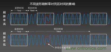 由此可知,死區(qū)時(shí)間的大小將影響捕獲周期的長短進(jìn)而影響波形刷新率的高低。如下圖所示: