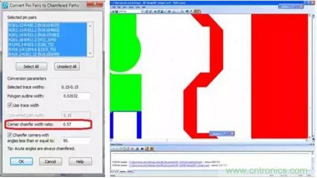 射頻和微波電路中經(jīng)常用到倒角,以減小饋線(xiàn)與電容器之間的分段不連續(xù)性電抗,從而改善MMIC 的頻率性能。90º 拐角與倒角之間的距離至關(guān)重要。因此,設(shè)計(jì)人員需要采用自動(dòng)方法來(lái)基于設(shè)計(jì)指定需要生成的倒角比率。PCB 設(shè)計(jì)工具如果能夠基于設(shè)計(jì)規(guī)則自動(dòng)強(qiáng)制實(shí)施需要生成的倒角比率,設(shè)計(jì)人員和工程師將會(huì)從中受益,在節(jié)省時(shí)間的同時(shí)提高設(shè)計(jì)質(zhì)量(圖3)。