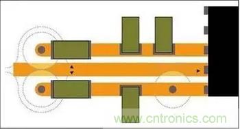 每個這些通孔都會在內(nèi)接地層上產(chǎn)生大于通孔直徑自身的禁入?yún)^(qū),提供制造空隙。這些禁入?yún)^(qū)很容易在回流路徑上造成中斷。一些通孔彼此靠近則會形成接地層溝,頂層CAD視圖看不見,這將導(dǎo)致情況進(jìn)一步復(fù)雜化。圖2兩個電源層通孔的接地層空隙可產(chǎn)生重疊的禁入?yún)^(qū),并在返回路徑上造成中斷?;亓髦荒苻D(zhuǎn)道繞過接地層禁入?yún)^(qū),形成現(xiàn)在常見的發(fā)射感應(yīng)路徑問題。