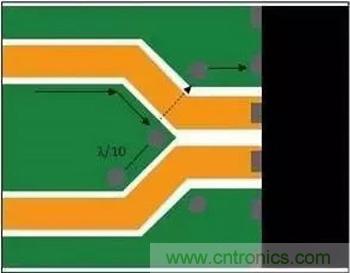 時鐘分布或合成器設(shè)備路由出來、用于承載相同頻率的跡線集群可能相鄰而行,因?yàn)楦蓴_源音調(diào)已經(jīng)存在于接收器線路上。不過,分組的線路最終會分散。分散時,應(yīng)在分散線路之間提供接地灌流,并在其開始分散的地方灌入通孔,以便感應(yīng)回流沿著額定回流路徑流回。在圖3中,接地島末端的通孔可使感應(yīng)電流流到參考層上。接地灌流上其它通孔之間的間隔不要超過一個波長的十分之一,以確保接地不會成為共振結(jié)構(gòu)。