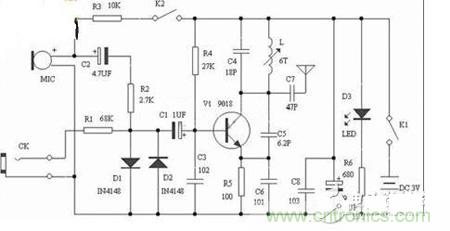 【導(dǎo)讀】FM調(diào)頻發(fā)射機,發(fā)射頻率在模擬廣播波段88~108Mhz,用普通FM收音機接收,2種音信輸入,MIC頭將周邊聲音發(fā)送,CK音信輸入,調(diào)??烧{(diào)發(fā)射線圈L可改變(微調(diào))發(fā)射頻率。