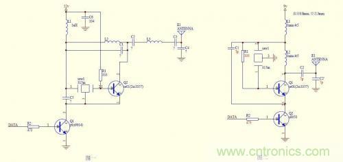 兩電路基本原理一致,都是由0、1信號控制實現(xiàn)高頻脈沖發(fā)射的電路,工作頻率由晶振決定,從穩(wěn)定性上分不出優(yōu)劣。圖二電路簡潔,稍容易調(diào)試些,圖一在三極管集電極與電源間加了選頻網(wǎng)絡(luò),在三極管集電極與天線之間也加了選頻網(wǎng)絡(luò),輸出頻率更純凈,但調(diào)試要麻煩些。再一點區(qū)別是圖二上方三極管的基極通過電阻引入了交流負反饋,其實這對該電路穩(wěn)定性的影響也并不明顯。電源上對地的高頻電容還是保留為好,但圖二中沒有畫出。