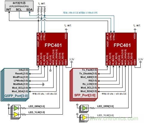 FPC401將多達(dá)56個(gè)端口的所有低速信號(hào)集成到單個(gè)快速I2C總線(高達(dá)1MHz)或串行外設(shè)接口(SPI)總線(高達(dá)10 MHz)中,大大降低了線路復(fù)雜性并簡化了設(shè)計(jì)可擴(kuò)展性。FPC401四個(gè)端口中的每一個(gè)端口都具有三個(gè)輸入、四個(gè)輸出和一個(gè)I2C主機(jī),從而實(shí)現(xiàn)對下游模塊的完全控制。有關(guān)SFP和QSFP連接的示例,請參見圖2。