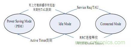 TAU周期請求定時器(T3412)由網(wǎng)絡(luò)側(cè)在ATTCH和TAU消息中指定,3GPP協(xié)議規(guī)定默認(rèn)為54min,最大可達(dá)310H。那么UE處理完數(shù)據(jù)之后,什么時候進(jìn)入PSM模式呢?這是由另一個定時器Activer Timer(T3324,0-255秒)決定的。UE處理完成數(shù)據(jù)之后,RRC連接會被釋放、進(jìn)入空閑態(tài),與此同時啟動Active Timer,此Timer超時后,UE即進(jìn)入上述PSM模式。轉(zhuǎn)換狀態(tài)如下(借圖):