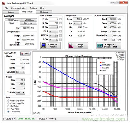 我們選擇由 LTC6946-3 產生 4GHz 輸出信號,并使用PLLWizard™軟件工具來確定,建立 LTC6946 周邊電路所需的濾波器組件值。PLLWizard 是一款免費工具,通過www.linear.com.cn/pllwizard提供,以輔助 LTC6946 的設計和仿真。