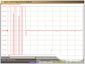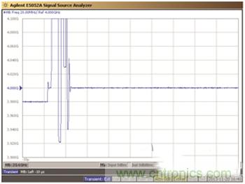 現在,我們來檢查一下,從 3.98GHz到 4.00GHz階躍 20MHz 之后,LTC6946 的輸出穩(wěn)定到與最終頻率值相差 10kHz 以內有多快。E5052A 可捕捉瞬態(tài)響應,如圖 3 所示。