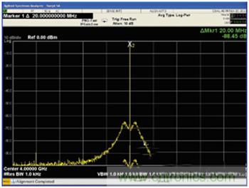 圖5:LTC6946 的輸出頻譜,在 4GHz 輸出、環(huán)路帶寬為 2MHz 時展示了不同尋常的低雜散噪聲