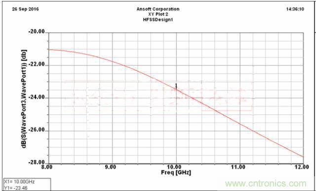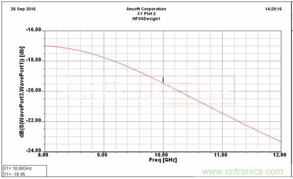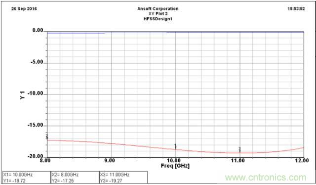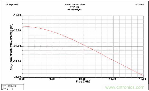 添加的C形環(huán)受到相同的磁場耦合,產(chǎn)生與主線相反的電流,從而對主線進(jìn)行二次耦合,增強(qiáng)了主線的耦合度。仿真了1mm耦合間距的耦合度,仿真結(jié)果如下圖4所示。在10GHz耦合-18.72dB,x波段耦合度-17.25~-19.27dB,波動2dB左右。