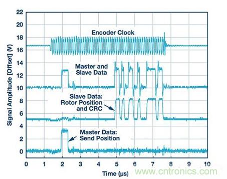圖6顯示了EnDat系統(tǒng)的測(cè)試結(jié)果。測(cè)試使用的時(shí)鐘頻率為8 MHz,延遲補(bǔ)償通過接收時(shí)鐘相移實(shí)現(xiàn)。底部信號(hào)是來自EnDat主機(jī)的命令。此處顯示的命令為“發(fā)送位置”,其前面是兩個(gè)0,接著是六個(gè)1,最后又是兩個(gè)0。該命令總共有10位。編碼器的響應(yīng)是從頂部起的第三個(gè)信號(hào)。合并數(shù)據(jù)線是從頂部起的第二個(gè)信號(hào)。最后,頂部信號(hào)是施加于編碼器的時(shí)鐘。