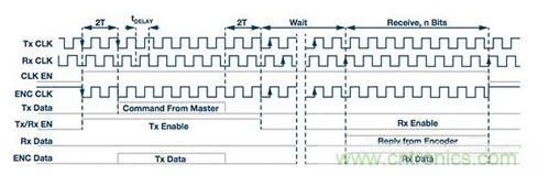 發(fā)送時(shí)鐘(Tx CLK)由處理器ADSP-CM40x產(chǎn)生。由于系統(tǒng)延遲,來自編碼器的數(shù)據(jù)在返回處理器之前會(huì)與發(fā)送時(shí)鐘錯(cuò)相。為補(bǔ)償傳輸延遲tDELAY,處理器還會(huì)產(chǎn)生一個(gè)接收時(shí)鐘(Rx CLK),它比發(fā)送時(shí)鐘延遲tDELAY。讓接收時(shí)鐘與自從機(jī)收到的數(shù)據(jù)同相是補(bǔ)償傳輸延遲的有效辦法。