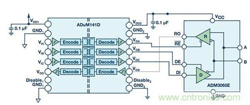 圖2. 信號(hào)隔離的50 Mbps RS-485解決方案(簡化圖,未顯示全部連接)。