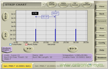 由于客戶的系統(tǒng)要進行長時間的(-20到+80度下)的高低溫老化測試,客戶要看誤碼的性能和溫度變化的相關性,一般的誤碼儀只能統(tǒng)計溫度變化過程中誤碼的總的個數(shù)和誤碼率,而無法得知在整個十幾個小時里面任一時刻誤碼率的變化。而BSX系列誤碼儀則可以使用Strip chart的記錄功能將整個過程中記錄下來,后面可以根據(jù)需要查詢?nèi)我鈺r刻的誤碼率變化情況。如下圖,在第10/20/30秒的時間點出現(xiàn)了一些突發(fā)的誤碼,這個如果僅僅是通過簡單的誤碼統(tǒng)計是無法看到時間相關的細節(jié)的,而且其累積記錄時間可以長達幾十小時甚至幾天。