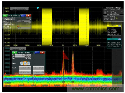 很多用慣了示波器的人都喜歡示波器的觸發(fā)功能,用各種觸發(fā)方式來隔離各種事件,穩(wěn)定顯示,觀察異常。在傳統(tǒng)頻譜儀上是很難實(shí)現(xiàn)觸發(fā)的,但是當(dāng)我們發(fā)現(xiàn)示波器的模板觸發(fā)方式,很容做到,把時(shí)域波形的實(shí)時(shí)頻譜變到頻域來觀察,借助MASK 測(cè)試的一些小工具,居然輕松設(shè)置和輕松觸發(fā)。因?yàn)槟0宓男螤钭杂删庉?,觸發(fā)的動(dòng)作自由組合,這樣的波形分析已經(jīng)完全跨越的時(shí)域和頻域的使用習(xí)慣,完全融合了時(shí)域和頻域?qū)π盘?hào)的思維方法了。