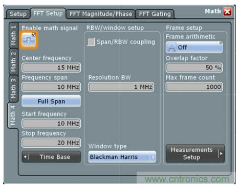 以前的示波器操控方式,無非是通過調(diào)整采集時(shí)間的長(zhǎng)度來影響分辨率帶寬,然后選擇感興趣的頻段來進(jìn)行觀察。現(xiàn)在做法是先選擇中心頻率,或者選擇好起始和截止頻率,通過直接調(diào)整RBW 來調(diào)整頻譜觀察方式,讓習(xí)慣頻譜儀的用戶也習(xí)慣示波器了。