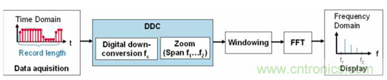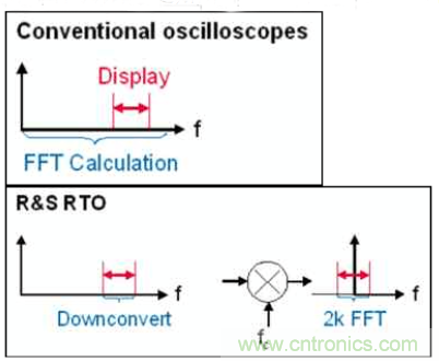 傳統(tǒng)的做法是,示波器把信號(hào)樣本采集下來,然后通過軟件算法來進(jìn)行軟件運(yùn)算,速度非常慢,我們的方式通過專用的硬件加速集成電路(ASIC),把fft 功能交給這個(gè)硬件電路來實(shí)現(xiàn),速度快到幾乎不影響原始波形的刷新速率。當(dāng)然這個(gè)ASI 是需要花大把銀子來研發(fā)的。核心對(duì)比用到了專用的DDC 電路。
