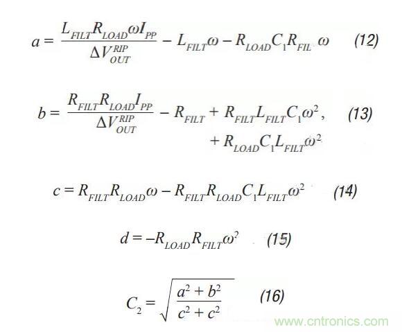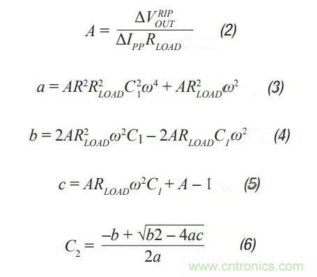 第3步:C2隨后可通過公式2至公式6計(jì)算得出。A、a、b和c是簡(jiǎn)化計(jì)算的中間值,沒有實(shí)際意義。這些公式假定R < />LOAD,且每個(gè)電容的ESR較小。這些都是很好的假設(shè),引入的誤差很小。C2應(yīng)等于或大于C1??烧{(diào)節(jié)第1步中的紋波,使其成為可能。