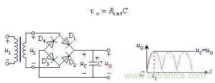 式中包括變壓器副邊繞組的直流電阻和二極管的正向?qū)娮?。由于一般很小,電容器很快就充到交流電壓u2的最大值,如波形圖2(b)的時(shí)刻。此后,u2開始 下降,由于電路輸出端沒接負(fù)載,電容器沒有放電回路,所以電容電壓值uC不變,此時(shí),uC>u2,二極管兩端承受反向電壓