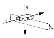 在這兩個邊緣之間產(chǎn)生的霍爾電壓VH與控制電流IC和磁通量B直接成正比(圖1)。霍爾發(fā)生器由一片薄傳導(dǎo)材料制成,如鎵砷化物(GaAs),這種材料在使用期間能夠?qū)崿F(xiàn)可靠穩(wěn)定的性能。在5 mA的控制電流下,獲得的霍爾電壓約為1.25 mV/mT。