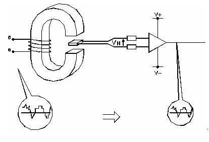 圖1.位于磁性電路間隙中的霍爾發(fā)生器把一次電流產(chǎn)生的磁場轉(zhuǎn)換成成比例的霍爾電壓