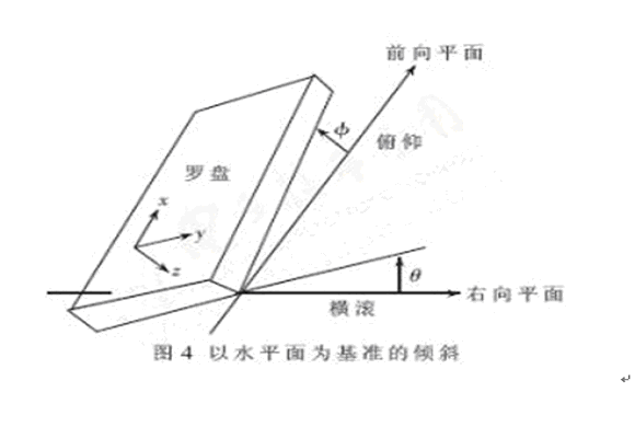 地球磁場(chǎng)的強(qiáng)度為0.6高斯左右,現(xiàn)有的磁阻傳感器可以很好地測(cè)量地磁場(chǎng)范圍內(nèi)的磁場(chǎng)強(qiáng)度。由于二維羅盤只能在保持水平的情況下正常工作,如果用于車輛的動(dòng)態(tài)環(huán)境中,將不可能保證其永遠(yuǎn)水平,所以在這種場(chǎng)合下,羅盤的可使用性大大降低。于是需要設(shè)計(jì)三維羅盤以適應(yīng)各種姿態(tài)的測(cè)量。三維電子羅盤的總體設(shè)計(jì)方案如圖3所示。三軸磁阻傳感器分別從X、Y、Z 三個(gè)磁場(chǎng)強(qiáng)度方向輸出電壓,經(jīng)過放大電路分別輸入到三個(gè)具有A/D轉(zhuǎn)換能力的MCU端口,二軸加速度傳感器測(cè)量俯仰角度和橫滾角度,測(cè)量參數(shù)的意義如圖4所示。