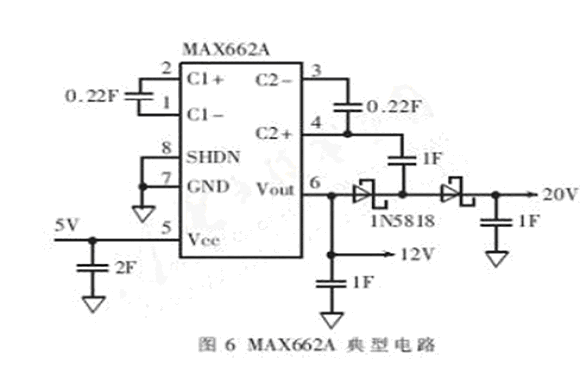 在HMC1055芯片上,置位/復(fù)位片的引腳名稱是S/R+和S/R-,沒有極性的區(qū)別,單個(gè)置位/復(fù)位帶標(biāo)準(zhǔn)阻值為2.0Ω,所以對(duì)于三軸系統(tǒng),三個(gè)金屬片串聯(lián)阻值為6.0Ω,則產(chǎn)生一個(gè)3~4A的最小脈沖驅(qū)動(dòng)一個(gè)6Ω的負(fù)載所需的供電電壓為18V~24V。由于系統(tǒng)芯片都是使用5V電源,所以需要將5V電壓升壓到20V左右,可以使用MAX662來完成。典型的電路如圖6所示。