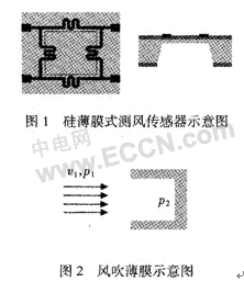 硅薄膜式測風(fēng)傳感器的設(shè)計(jì)示意圖如圖1所示。薄膜式風(fēng)速風(fēng)向傳感器主要是利用風(fēng)吹薄膜對薄膜產(chǎn)生風(fēng)壓,風(fēng)壓導(dǎo)致薄膜形變,薄膜上的應(yīng)變電阻就會感應(yīng)到薄膜的形變。通過測量應(yīng)變電阻的變化即可解算出風(fēng)速大小。設(shè)定測量時(shí)風(fēng)正面吹向薄膜如圖2所示。