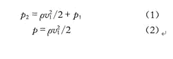 圖2中:υ1表示風(fēng)的平均流速;p1表示風(fēng)流的壓力;p2表示薄膜所受的壓力,應(yīng)用流體力學(xué)中理想伯努力方程如式(1)。其中p為空氣的密度,化簡后可以得出薄膜承受絕對壓強(qiáng)p的變化與風(fēng)速的關(guān)系如式(2),即