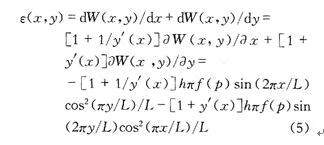 p是作用在膜上的絕對壓強(qiáng);E和υ分別為薄膜材料的楊氏模量和泊松比。材料的形變定義為單位長度材料的變化。設(shè)ε(x,y)是薄膜的應(yīng)變函數(shù),可以用式(5)來計(jì)算,則