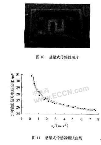 依據(jù)所設(shè)計(jì)的原理及工藝流程,首先制作了懸梁式測風(fēng)傳感器如圖10所示。傳感器為雙懸梁結(jié)構(gòu),通過惠斯通電橋輸出傳感器測量信號,其測試圖如圖11所示。