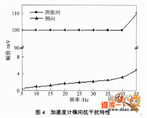 對單自由度的低頻光纖光柵加速度計來說,橫向抗干擾特性也是一項重要指標(biāo).實驗在加速度計的測振方向以及與其垂直的側(cè)向分別加0.5g的加速度,在5~45 Hz的頻帶范圍內(nèi)對兩個方向的振動值進(jìn)行了對比,測量結(jié)果如圖4所示.從圖中可以看出,在加速度計的測振方向激振時加速度計測量輸出維持在100 mV 附近,而在與測振垂直方向激振時輸出在1~4mV范圍內(nèi),其橫向抗干擾能力達(dá)40 dB.可見此種設(shè)計方案可以有效降低橫向干擾的影響.