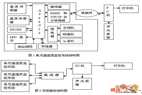 可根據(jù)實(shí)際情況由若干單元溫濕度監(jiān)控系統(tǒng)通過(guò)集線器組成一個(gè)完整的遠(yuǎn)程分布式溫濕度智能監(jiān)控系統(tǒng)(系統(tǒng)整體結(jié)構(gòu)圖見(jiàn)圖2)。