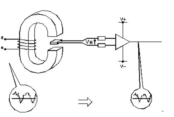 圖1.位于磁性電路間隙中的霍爾發(fā)生器把一次電流產(chǎn)生的磁場轉換成成比例的霍爾電壓。