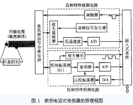 設計的微變電容式傳感器的原理框圖如圖1 所示。該傳感器由同軸電纜、高低頻信號分離電路、高頻特性檢測電路、低頻特性檢測電路和嵌入式系統(tǒng)等組成。高頻特性檢測電路監(jiān)測同軸電纜特性阻抗的變化, 而低頻特性監(jiān)測電路則監(jiān)測同軸電纜分布電容的變化, 兩電路相互補充完成對同軸電纜的局部變形的監(jiān)測和定位。
