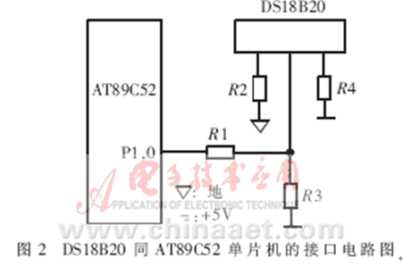DS18B20的測溫原理為:內(nèi)部計(jì)數(shù)器對一個(gè)受溫度影響的振蕩器的脈沖計(jì)數(shù),低溫時(shí)振蕩器的脈沖可以通過門電路,而當(dāng)?shù)竭_(dá)某一設(shè)置高溫時(shí),振蕩器的脈沖無法通過門電路。計(jì)數(shù)器設(shè)置為-55℃時(shí)的值,如果計(jì)數(shù)器到達(dá)0之前門電路未關(guān)閉,則溫度寄存器的值將增加,這表示當(dāng)前溫度高于-55℃。同時(shí),計(jì)數(shù)器復(fù)位在當(dāng)前溫度值上,電路對振蕩器的溫度系數(shù)進(jìn)行補(bǔ)償,計(jì)數(shù)器重新開始計(jì)數(shù)直到回零。如果門電路仍然未關(guān)閉,則重復(fù)以上過程。溫度轉(zhuǎn)換所需時(shí)間不超過750ms,得到的溫度值的位數(shù)因分辨率不同而不同[2]。DS18B20同AT89C52單片機(jī)的接口電路如圖2所示。這種接口方式只需占用單片機(jī)一根口線,與智能儀器或智能測控系統(tǒng)中的其它單片機(jī)或DSP的接口也可采用類似的方式。