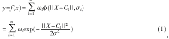 上式中,m是隱含層結(jié)點(diǎn)數(shù);||•||是歐幾里德范數(shù);X,Ci∈Rn, ωi是第i個(gè)基函數(shù)與輸出結(jié)點(diǎn)的連接權(quán)值(i=1,2,...,m)。