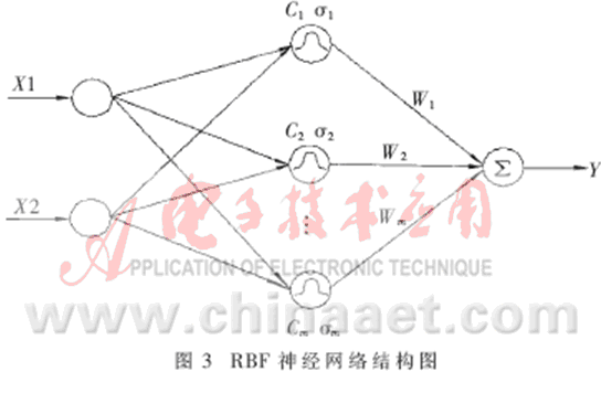 RBF神經(jīng)網(wǎng)絡(luò)即徑向基函數(shù)(Radial Basis Function)神經(jīng)網(wǎng)絡(luò)[3~4],其結(jié)構(gòu)如圖3所示。它很容易擴(kuò)展到多輸出節(jié)點(diǎn)的情形,在此只考慮一個(gè)輸出變量Y的情況。RBFNN包括一個(gè)輸入層、一個(gè)隱含層和一個(gè)輸出層的最簡模式。隱含層由一組徑向基函數(shù)構(gòu)成,與每個(gè)隱含層節(jié)點(diǎn)相關(guān)的參數(shù)向量為Ci(即中心)和σi(即寬度)。徑向基函數(shù)有多種形式,一般取高斯函數(shù)[5]。具體如下: